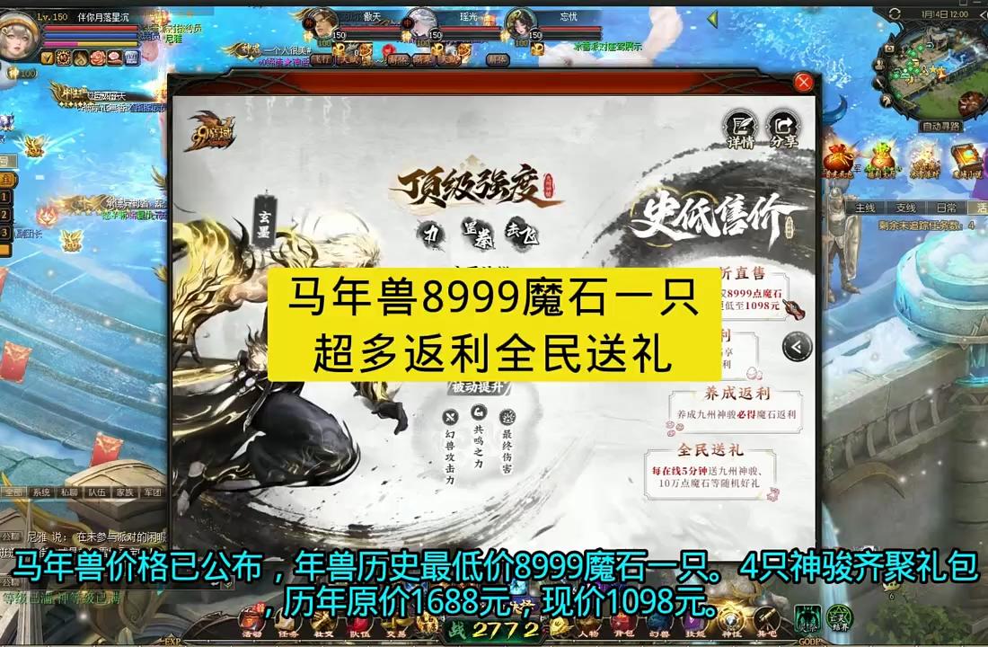 1月23日维护后~2月24日24点,购买九州神骏系列礼包,即可获取最高3万点魔石奖励。