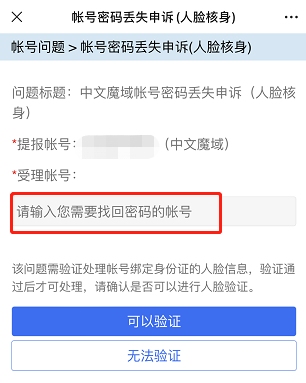 第四步:(以找回帐号密码为例)输入需要找回密码的账号,点击“可以验证”进行人脸验证。只要人脸信息与预留的身份证信息通过核验,即可找回帐号密码啦。