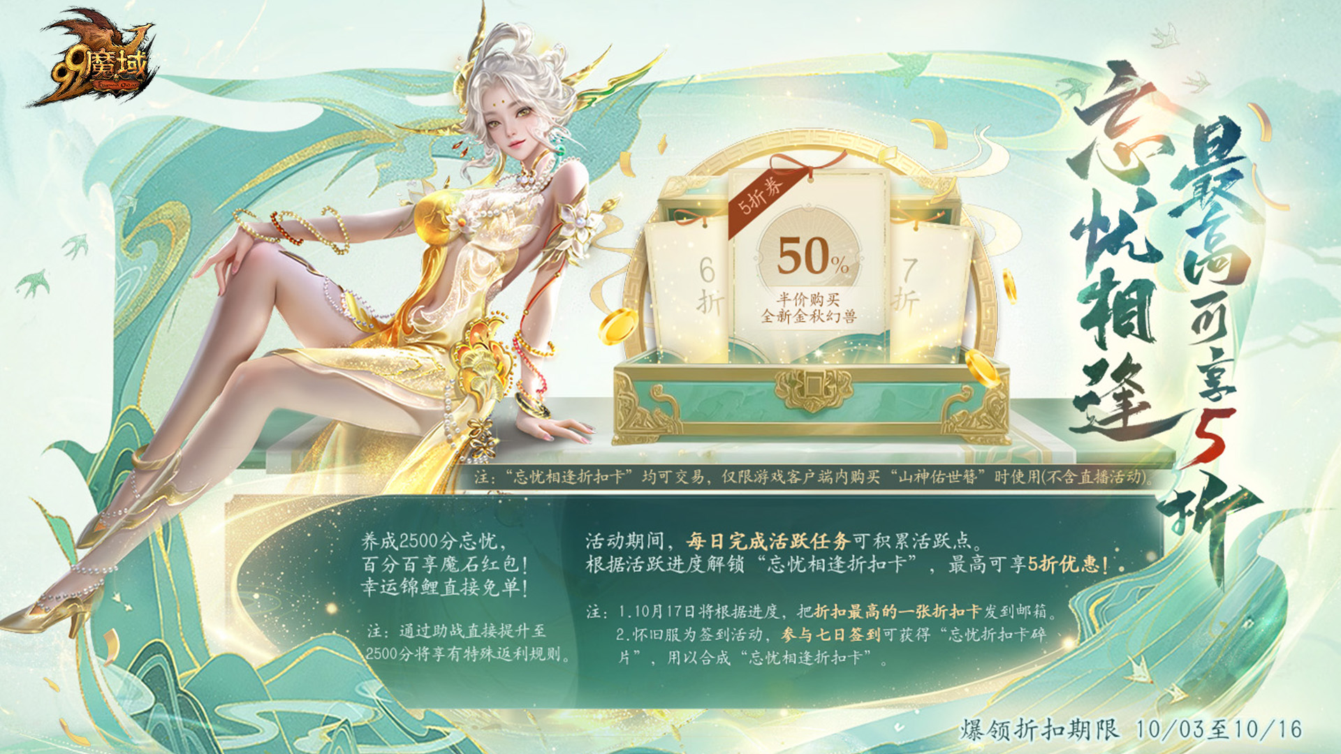10月3日至10月16日(先锋服时间为10月1日至10月14日),神火源力评分≥20.9万的勇士,每日完成指定活跃任务即可积累活跃点,解锁“忘忧相逢折扣卡”。每日最多可完成3次任务,活动期间累计活跃点达到2000点,最高可获得5折折扣优惠!