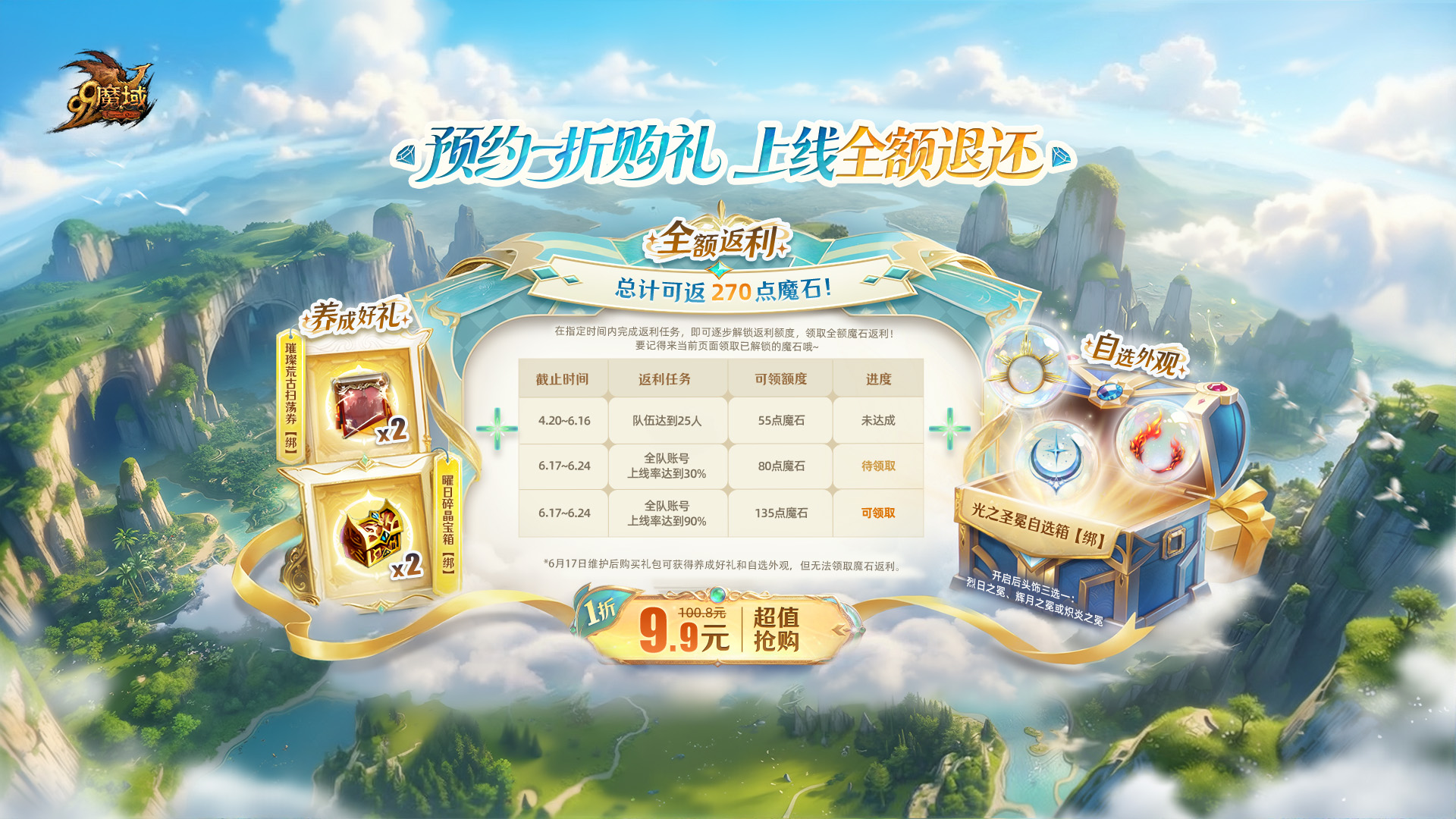 预约后可享一折劲爆价,以9.9元限时低价拿下“养成好礼+自选外观”!包含璀璨荒古扫荡券【绑】x2、曜日碎晶宝箱【绑】x2、光之圣冕自选箱【绑】头饰三选一。
